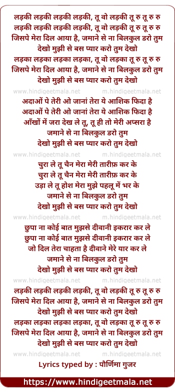 Lyrics of Ladakee Ladakee Too Woh Ladakee - लड़की लड़की लड़की लड़की, तू वो लड़की तू रु तू रु रु