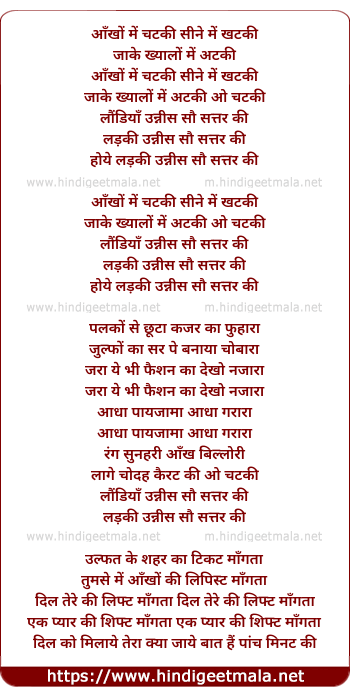 Lyrics of Ladki Unnis Sau Sattar Ki - लड़की उन्नीस सौ सत्तर की