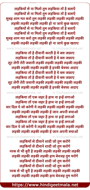 Lyrics of Ladkiyo Se Na Milo Tum Ladkiya To Hai Balaye - लड़कियों से ना मिलो तुम लड़किया तों है बलाएँ
