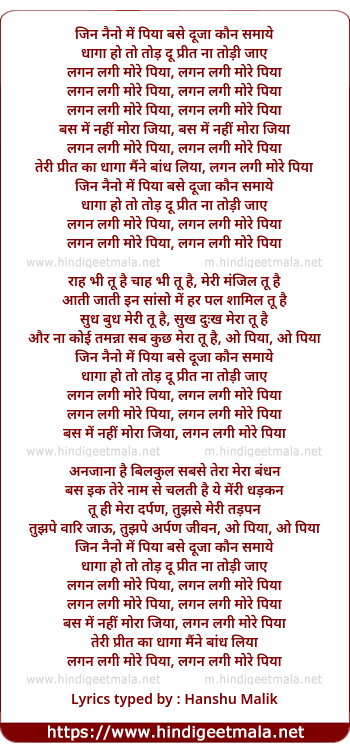 Lyrics of Lagan Lagi More Piyaa - लगन लगी मोरे पिया