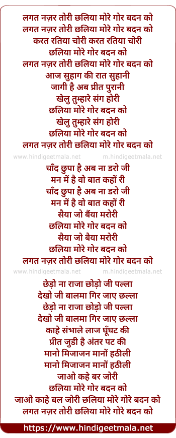 Lyrics of Lagat Nazar Tori Chalaiya - लगत नज़र तोरी छलिया मोरे गोर बदन को