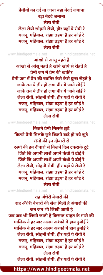 Lyrics of Laila Roi Sohni Royi, Heer Yaha Par Royi - लैला रोयी सोहनी रोयी, हीर यहाँ पे रोयी