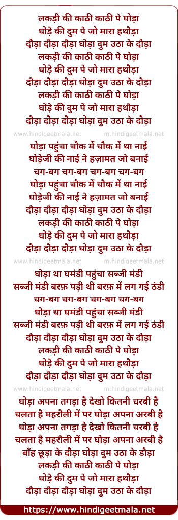 Lyrics of Lakadi Ki Kaathi Kaathi Pe Ghodaa - लकड़ी की काठी काठी पे घोड़ा