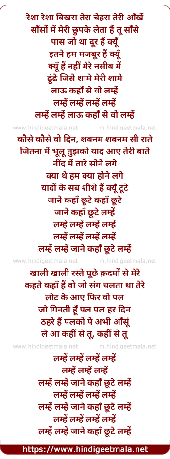 Lyrics of Lamhe - रेशा रेशा बिखरा तेरा चेहरा तेरी आँखें