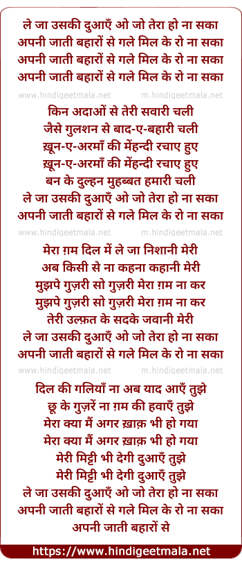 Lyrics of Le Ja Usakee Duwaye O Jo Teraa Ho Naa Saka - ले जा उसकी दुआएँ ओ जो तेरा हो ना सका