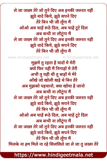 Lyrics of Le Ja Zakhm Tere - ले जा जख्म तेरे जो तुने दिए अब इनकी जरुरत नही
