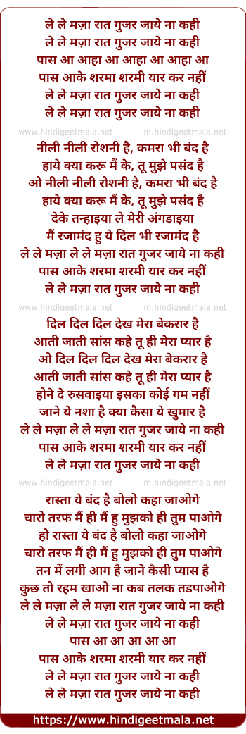 Lyrics of Le Le Mazaa Raat Gujar Jaye Naa Kahi - ले ले मज़ा रात गुजर जाये ना कही