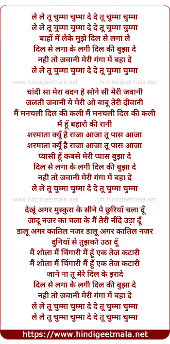 Lyrics of Le Le Tu Chumma Chumma - ले ले तू चुम्मा चुम्मा