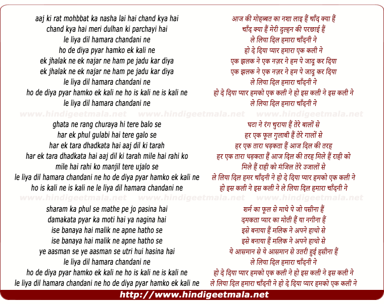 le liya dil hamara chandani ne ho de diya pyar hamko ek kali ne