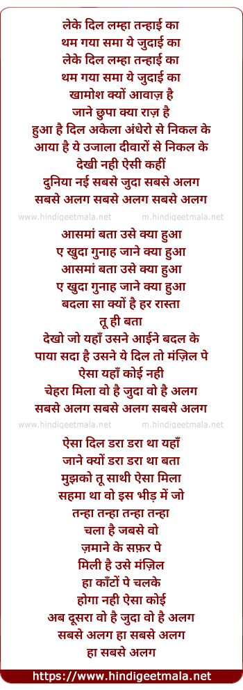 Lyrics of Leke Dil Lamha Tanhai Ka - लेके दिल लम्हा तन्हाई का