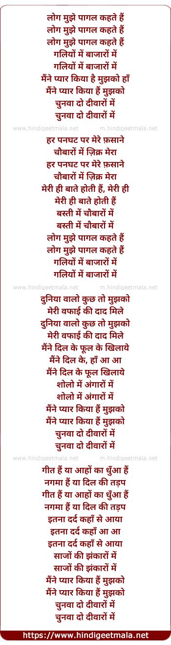 Lyrics of Log Mujhe Pagal Kehte Hai - लोग मुझे पागल कहते हैं