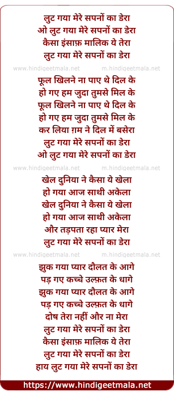 Lyrics of Lut Gayaa Mere Sapanon Kaa Deraa - लुट गया मेरे सपनों का डेरा
