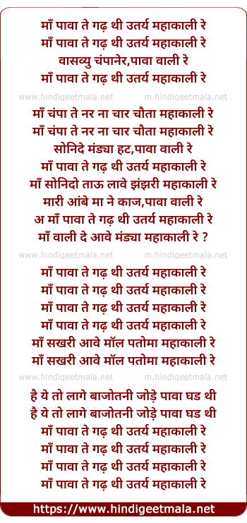 Lyrics of Ma Pava Te Gadh Thee Utarya Mahakalee Re - माँ पावा ते गढ़ थी उतर्य महाकाली रे
