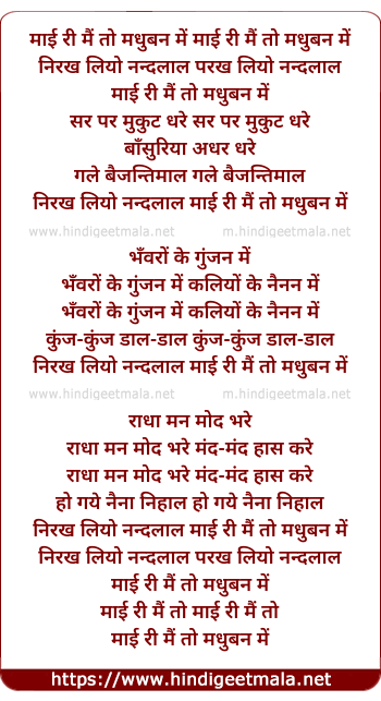 Lyrics of Mai Ri Main To Madhuban Me Nirakh Liyo Nandalal - माई री मैं तो मधुबन में निरख लियो नंदलाल