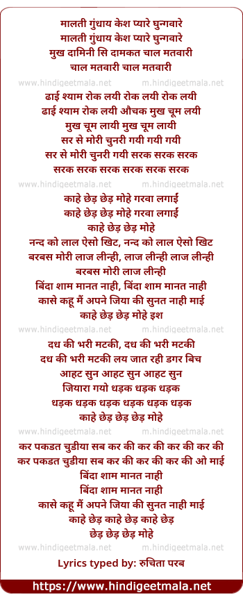Lyrics of Maalati Gundhaay Kesh Kaare Ghungharaare - मालती गुंधाय केश प्यारे घुन्गवारे