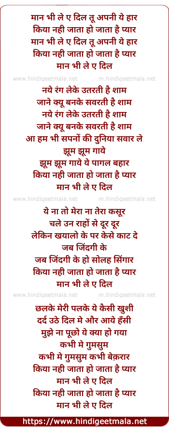 Lyrics of Maan Bhi Le Ae Dil Tu Apni Ye Haar - मान भी ले ए दिल तू अपनी ये हार