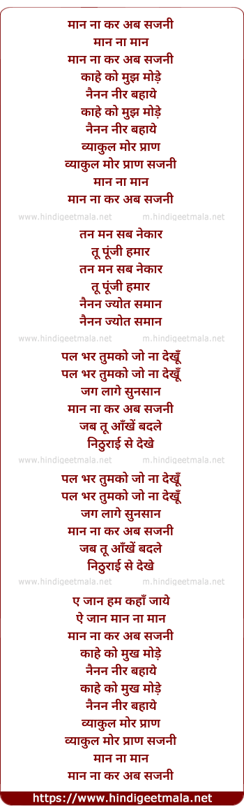 Lyrics of Maan Na Kar Ab Sajni - मान ना कर अब सजनी