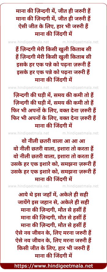 Lyrics of Maana Ke Zindagi Me - माना की ज़िन्दगी में, जीत ही जरुरी हैं
