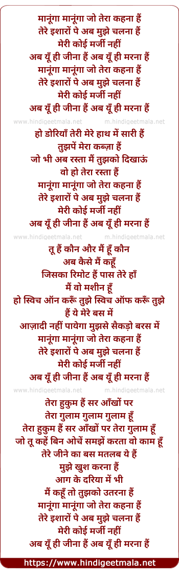 Lyrics of Maanunga Maanunga Jo Tera Kehana Hai - मानूंगा मानूंगा जो तेरा कहना हैं