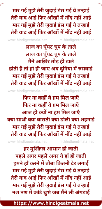 Lyrics of Maar Gayi Mujhe Judaai, Das Gayi Yeh Tanhai - मार गई मुझे तेरी जुदाई डंस गई ये तन्हाई