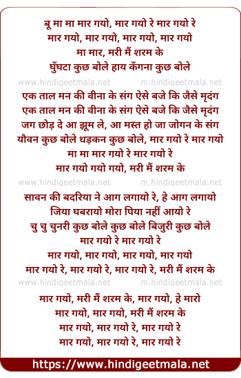 Lyrics of Maar Gayo Re, Mari Main Sharam Ke - मार गयो रे, मरी मैं शर्म के