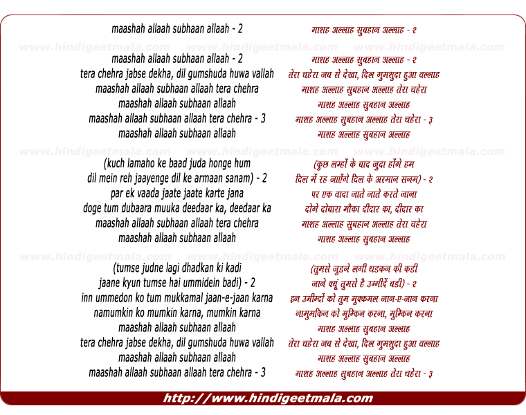 Lyrics of Maashah Allaah Subhaan Allaah Tera Chehra Jabse Dekha Dil Gumshuda Hua Vallah - माशा अल्लाह सुभान अल्लाह तेरा चेहरा जबसे देखा दिल गुमशुदा हुआ वल्लाह