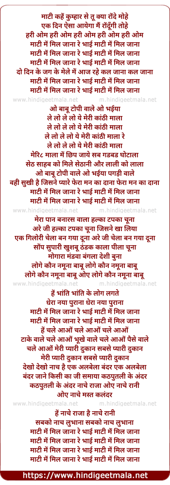 Lyrics of Maati Kahe Kumbhar Se Tu Kya Raunde Mohe - माटी कहें कुम्हार से तू क्या रोंदे मोहे