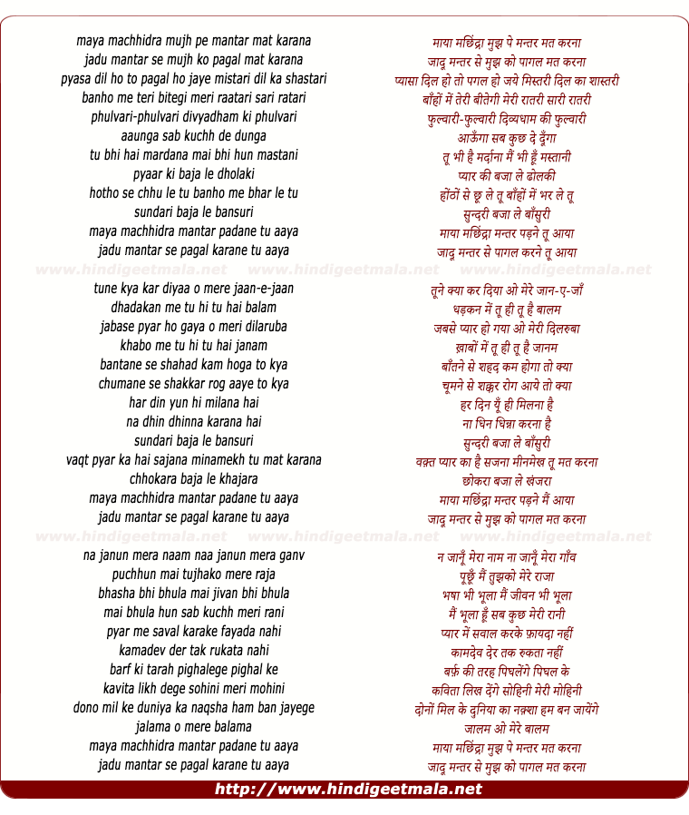Comments for lyrics of song "Maayaa Machhindraa Mujh Pe Mantar Mat Karanaa"