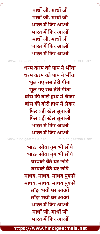 Lyrics of Madhoji Madhoji Bharat Me Phir Aao - माधों जी, माधों जी