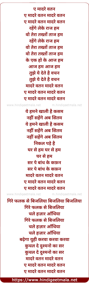 Lyrics of Madre Watan Ae Madre Watan