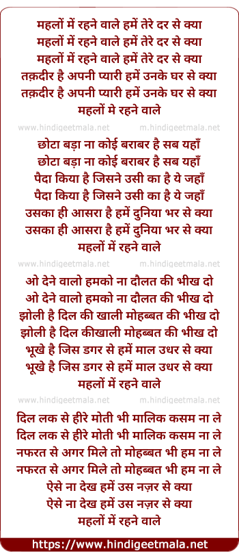 Lyrics of Mahalon Me Rehne Wale Hume Tere Dar Se Kya - महलों में रहने वाले हमें तेरे दर से क्या