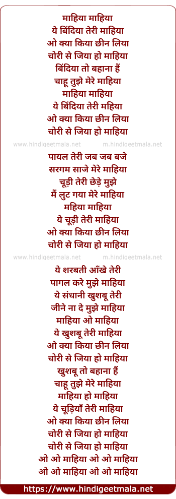 Lyrics of Mahiya Mahiya Ye Bindiya Teri Mahiya - माहिया माहिया