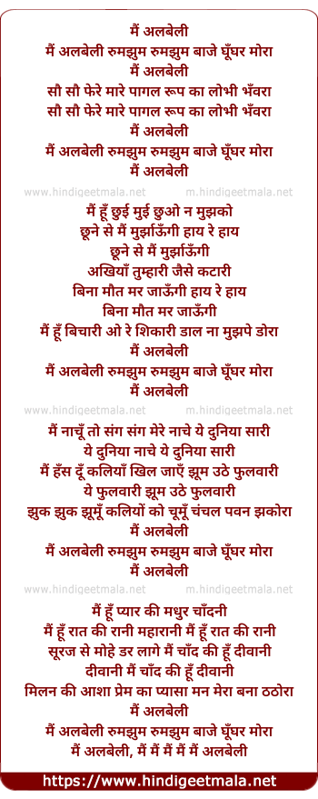 Lyrics of Mai Albeli Rumjum Baje Ghungar Mera - मैं अलबेली रुमझुम बाजे घूँघर मोरा