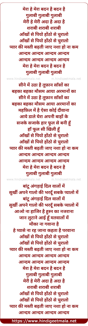 Lyrics of Mera Badaan Hai Gulabi - मेरा बदन है गुलाबी