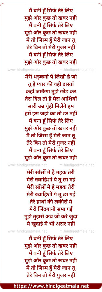 Lyrics of Main Bani Hu Sirf Tere Liye - मैं बनी हूँ सिर्फ तेरे लिए