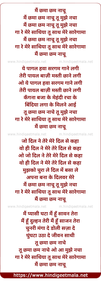 Lyrics of Mai Chhama Chham Nachu Tu Muje Nacha - मैं छमा छम नाचू तू मुझे नचा