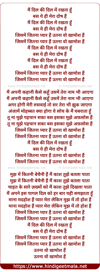 Lyrics of Mai Dil Kee Dil Me Rakhata Hu - मैं दिल की दिल में रखता हूँ