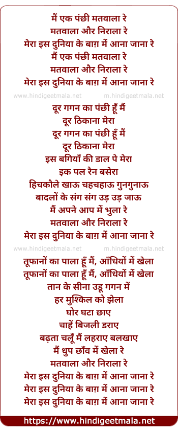 Lyrics of Mai Ek Panchi Matwala Re - मैं एक पंछी मतवाला रे