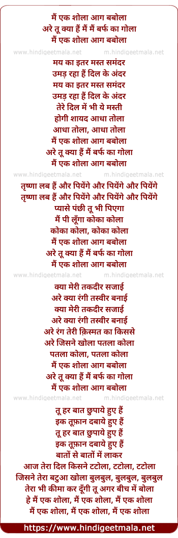 Lyrics of Mai Ek Shola Aag Babola - मैं एक शोला आग बबोला