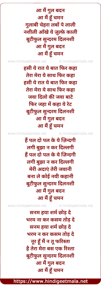 Lyrics of Aa Mai Gul Badan (2) - आ मैं गुल बदन