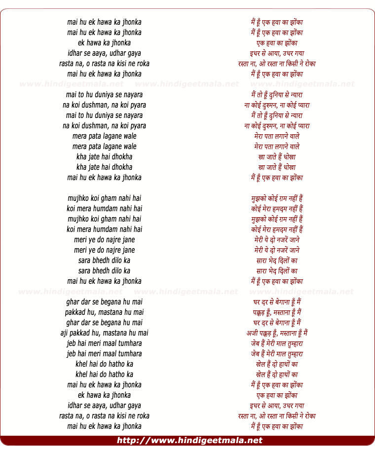Lyrics of Mai Hu Ek Hawa Ka Jhonka - मैं हूँ एक हवा का झोंका