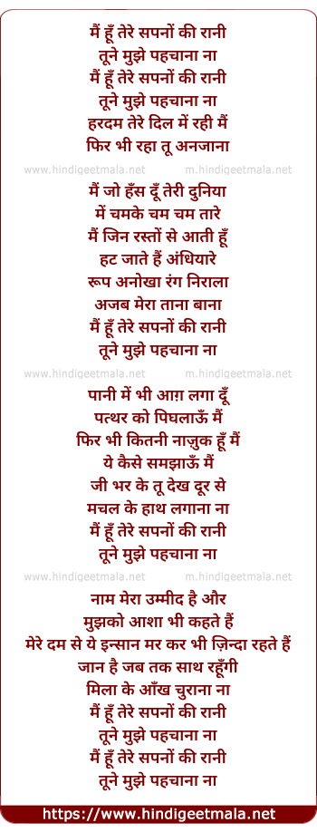 Lyrics of Mai Hu Tere Sapno Ki Rani - मैं हूँ तेरे सपनों की रानी