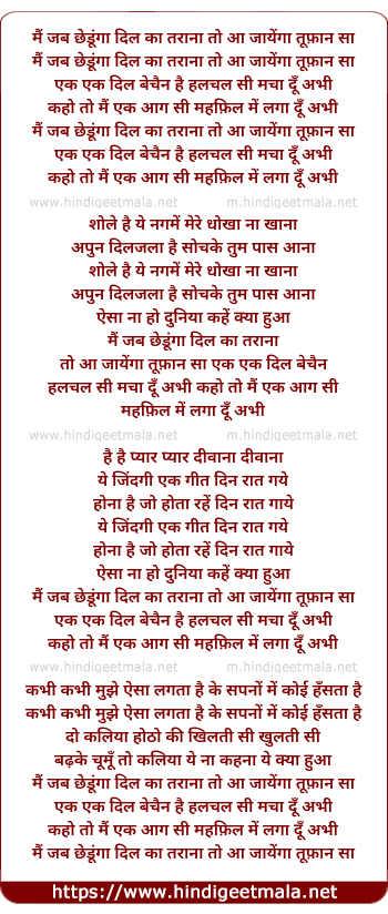 Lyrics of Mai Jab Chhedunga Dil Ka Taraana To Aa Jayega Tufaan Sa - मैं जब छेडूंगा दिल का तराना तो आ जायेंगा तूफ़ान सा