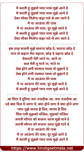 Lyrics of Mai Karatee Hu Tujhase Pyar - मै करती हू तुझसे प्यार