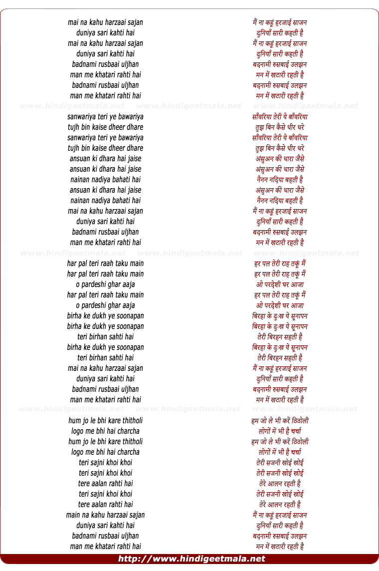 Lyrics of Mai Na Kahu Harjayi Saajan - मैं ना कहूं हरजाई साजन