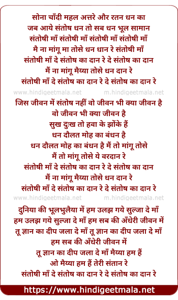 Lyrics of Santoshi Maa De Santosh Ka Daan Re - संतोषी माँ दे संतोष का दान रे