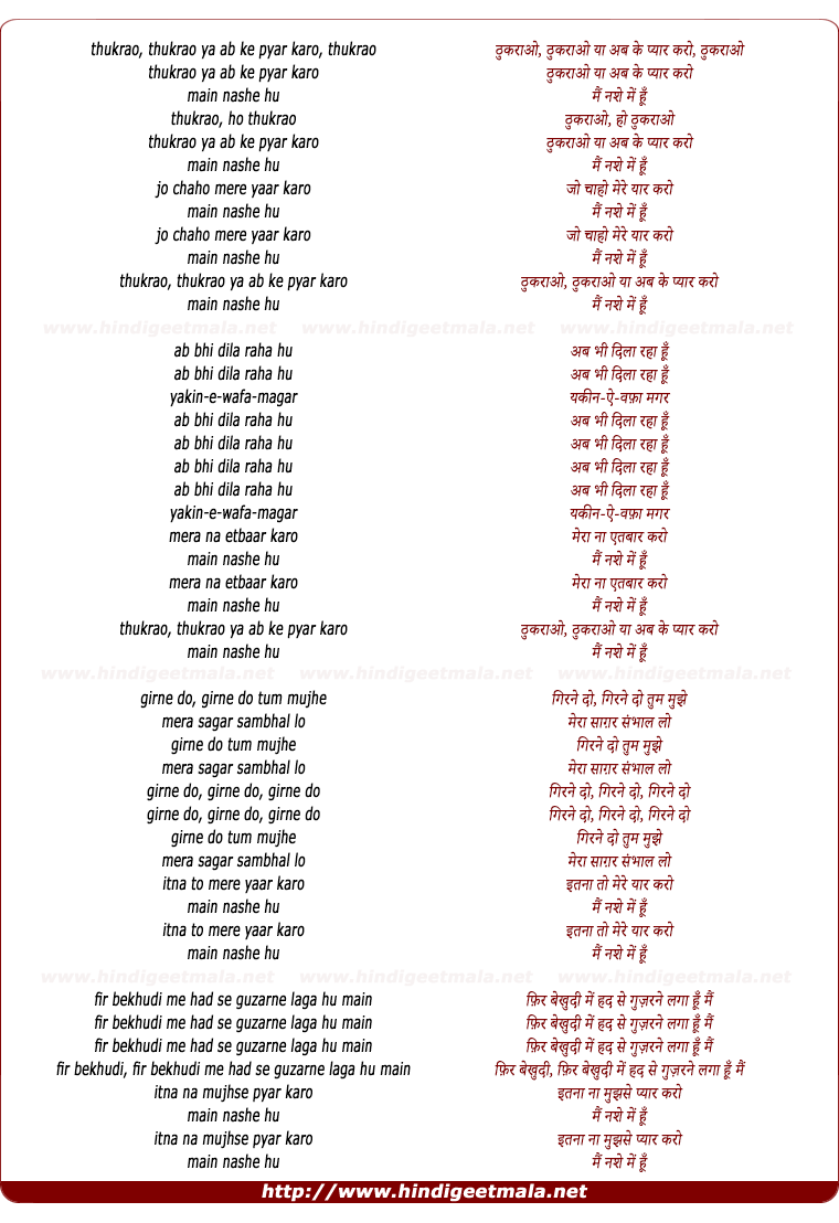 Lyrics of Mai Nashe Me Hu - ठुकराओ, ठुकराओ या अब के प्यार करो, ठुकराओ