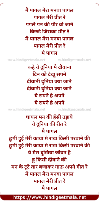 Lyrics of Mai Pagal Mera Manva Pagal - में पागल मेरा मनवा पागल