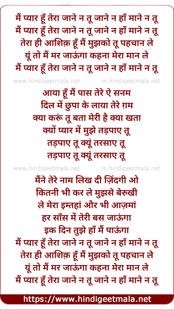 Lyrics of Mai Pyar Hu Tera Jane Na Too - मैं प्यार हूँ तेरा जाने न तू