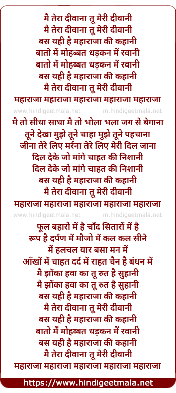 Lyrics of Mai Tera Diwana Tu Meri Deewani - मै तेरा दीवाना तू मेरी दीवानी